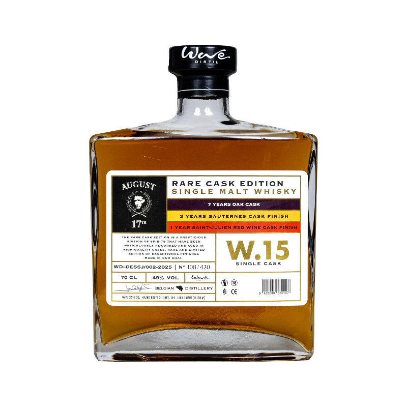W.15 酒款以陳放於橡木桶 7 年的酒液為基礎,承襲獨特的過桶工藝,於法國蘇玳產區 Château d’Yquem 貴腐酒桶中再熟成 3 年,最後於聖朱利安產區 Château Talbot 紅酒桶融合熟成 1 年。三重橡木桶的淬鍊,凝聚兩座世界頂級酒莊的風味精髓,交織出優雅而深邃的多層次香氣與口感。